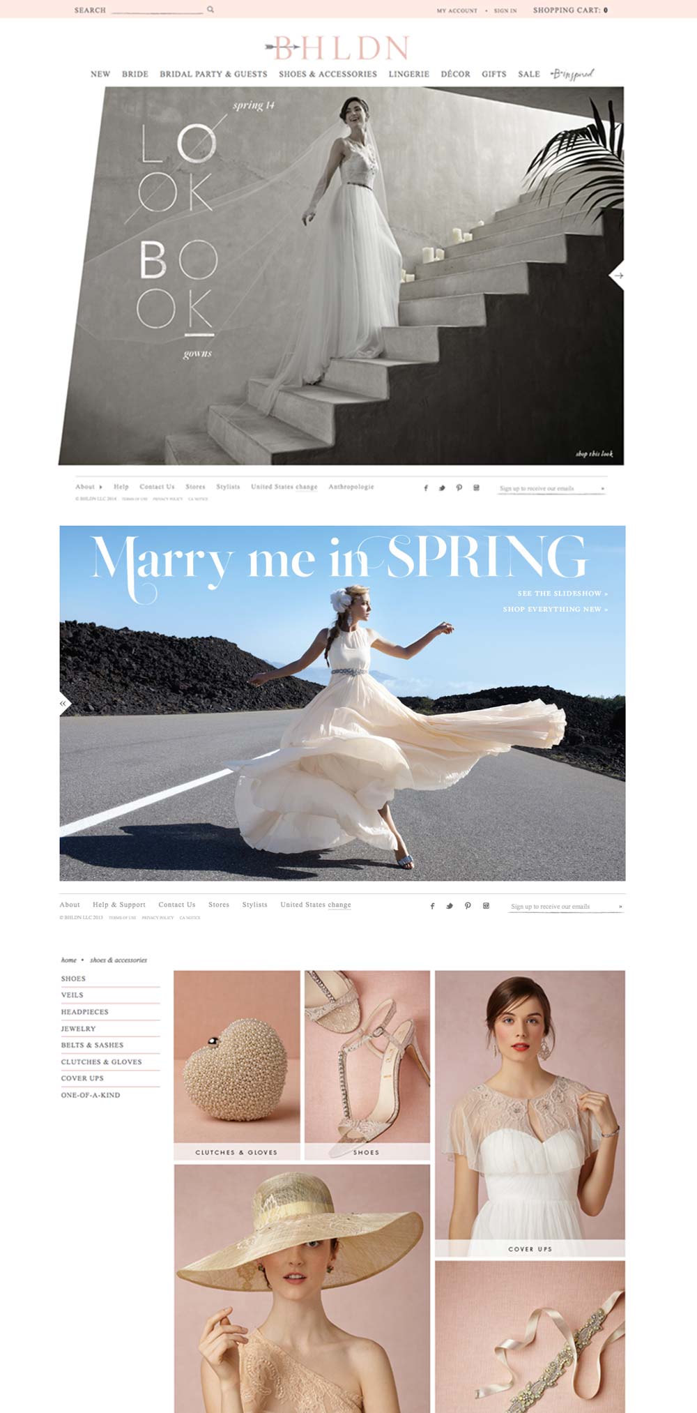 Working closely with European bridal and ready-to-wear designers, I wanted to create a boutique feel for the brand. My vision was to furnish both the verbal and visual identity with a contemporary European aesthetic. This became the new language for BHLDN – a brand ethos that was used everywhere from window displays and store interiors to digital media.
